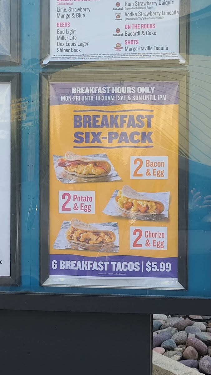 2 Bacon & Egg Tacos, 2 Bean & Cheese Tacos, 1 Potato & Egg Taco, & 1 Chorizo & Egg Taco.